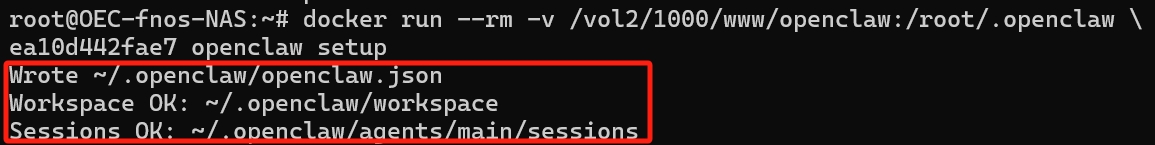 docker run --rm -v [你的路径]:/root/.openclaw \ [镜像ID] openclaw setup