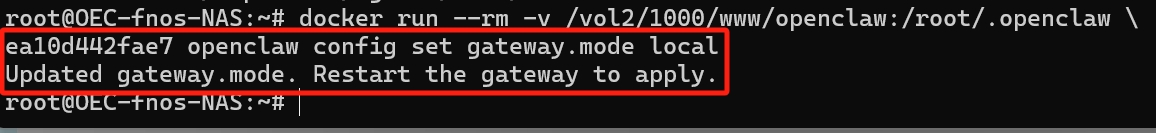 docker run --rm -v [你的路径]:/root/.openclaw \ [镜像ID] openclaw config set gateway.mode local