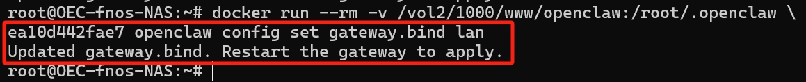 docker run --rm -v [你的路径]:/root/.openclaw \ [镜像ID] openclaw config set gateway.bind lan
